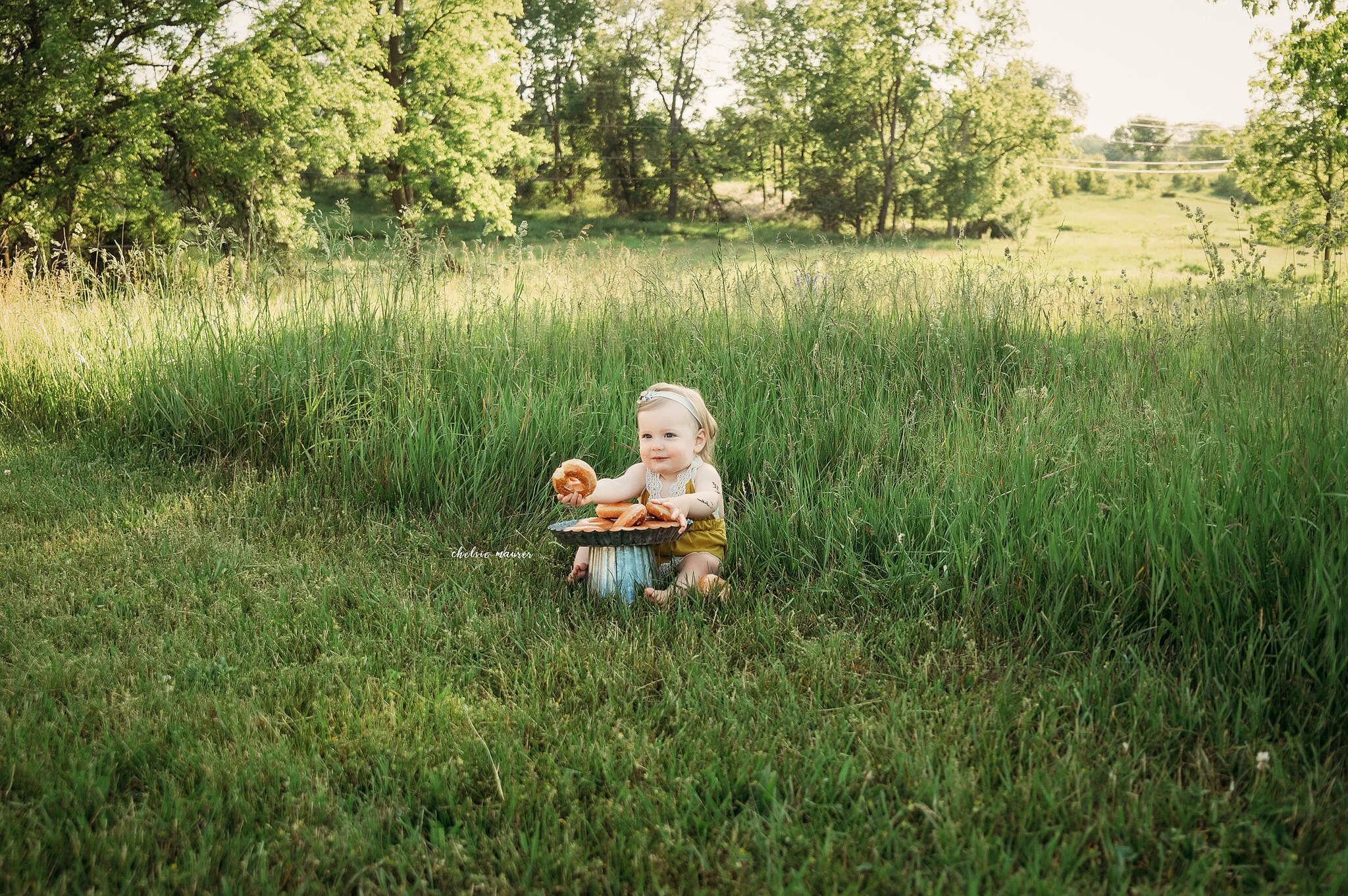 Often times when parents reach out to me to get one year old pictures done of their little one, we will incorporate the theme of their first birthday into their photo session. With my little friend, Macie, her birthday theme was “Sweet One” with DONUTS! Talk about cuteness. With that being said, we decided for her photo shoot to do a “donut smash” rather than a cake smash.